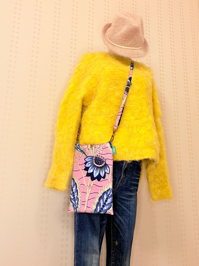 ◆ショルダー付きミニ手提げ (ハンドメイドにつき1点のみ) 【ネコポスでの発送も可能ですが、二つ折りにしてお送りいたしますのでたたみじわがついてしまいますことご了承くださいませ。スチームアイロンなどでのお手入れでしわは伸ばしていただけます】 最大8種の異なる布の組み合わせを楽しめる、気分の上がるショルダー付きミニ手提げです。 GNの貴重品ポーチ(長財布くらいの大きさ)が縦にすっぽり入る大きさの手提げに、スナップとファスナーのダブルポケットを付けており機能的にお使いいただけます。 ショルダーを外してバッグインバッグとしてお財布、スマホ、サングラスなどをまとめておいたり、そのまま取り出してショルダーをつけて身軽に外出にも。 接着芯などは使用しておりませんのでくたっと柔らかく身体に沿うラフな仕上がりです。 着画写真は外ポケットがひとつの旧タイプですが、全体の大きさは変わりませんのでサイズ感のご参考になさってください。 ◆ファスナー付きのポケットにはパスポートやカードキーなどの貴重品を ◆すぐ取り出したいスマホや搭乗券などはスナップポケットにすっと入れて ◆カラビナなどで鍵を引っかけられるようコットンのロゴループも内側に縫いこんでいます ◆ショルダー紐は取り外し可能ですので、お手持ちの革やチェーンのストラップに付け替えていただいてもかわいいですよ ◆ショルダー紐は男性でもお使いいただけるよう長めに作成しており、移動カンが付いていますので長さの調節可能です 同じ布の組み合わせで複数製作いたしません、貴女だけの一枚をお楽しみください。 - 高さ:約27cm - 横:約17cm - スナップポケット高さ:約20cm - ファスナーポケット高さ:約13cm - ショルダー紐:金具部分含まず最大約120cm(調節可能) 注: - アフリカ布の特性として色のにじみやかすれなどがたまに見られることがあります。味としてアフリカ大陸のような大きな心で楽しんでいただけると嬉しいです - お洗濯は手洗いをお勧めいたします - また、丁寧に作成しておりますが、ハンドメイド品ですのでこちらも既製品のようなクオリティには至らない点がありますことどうぞご了承くださいませ