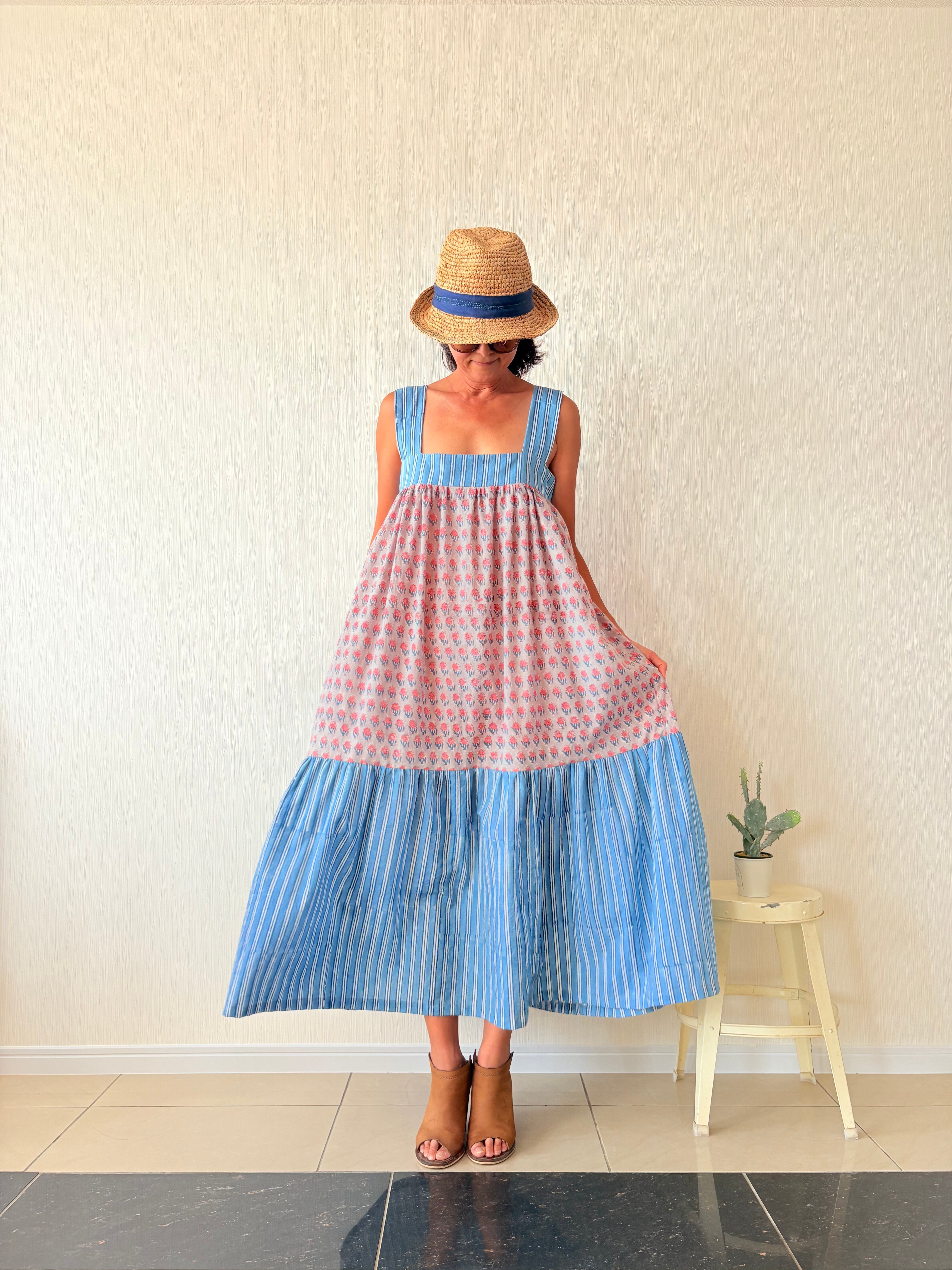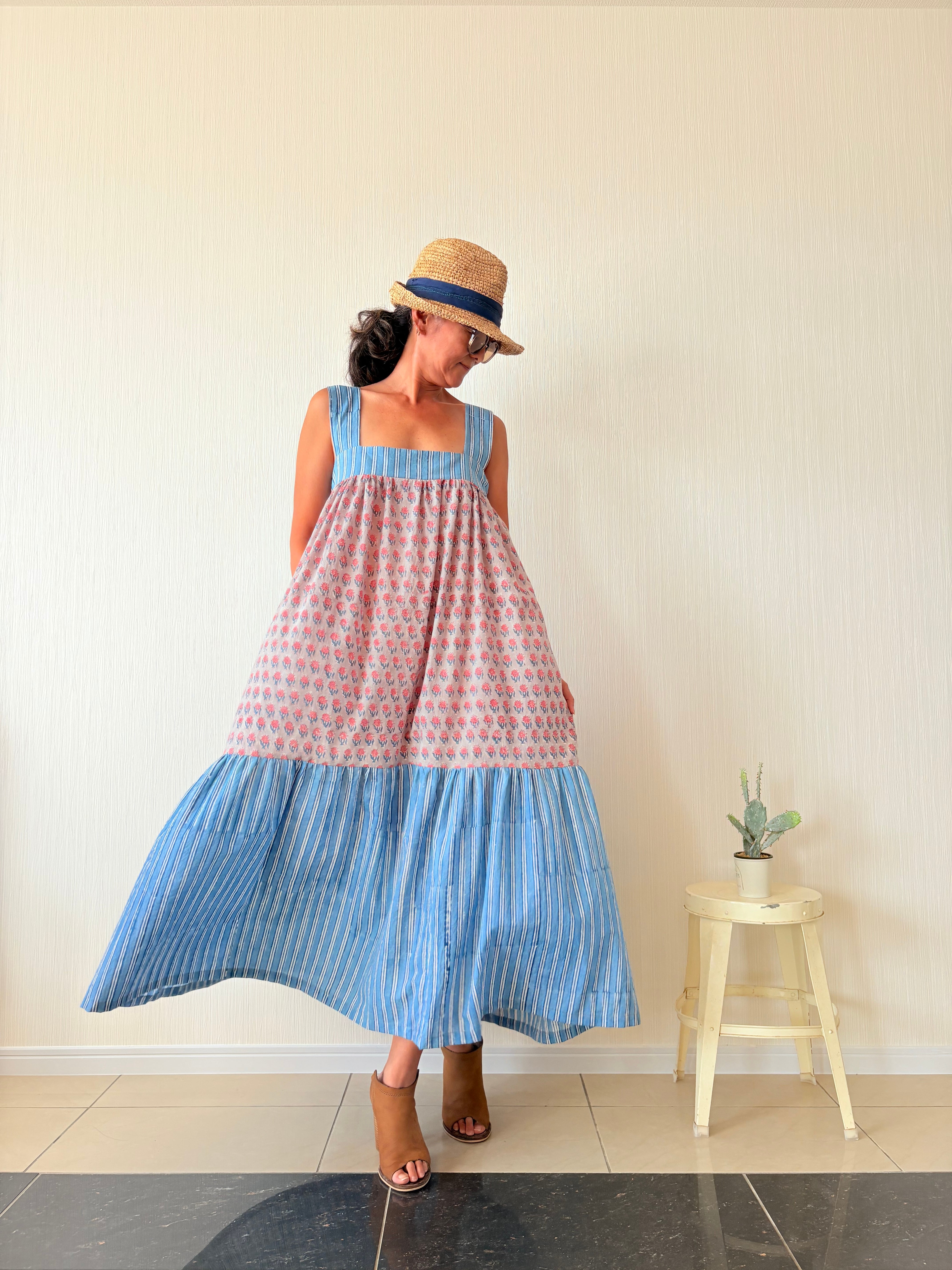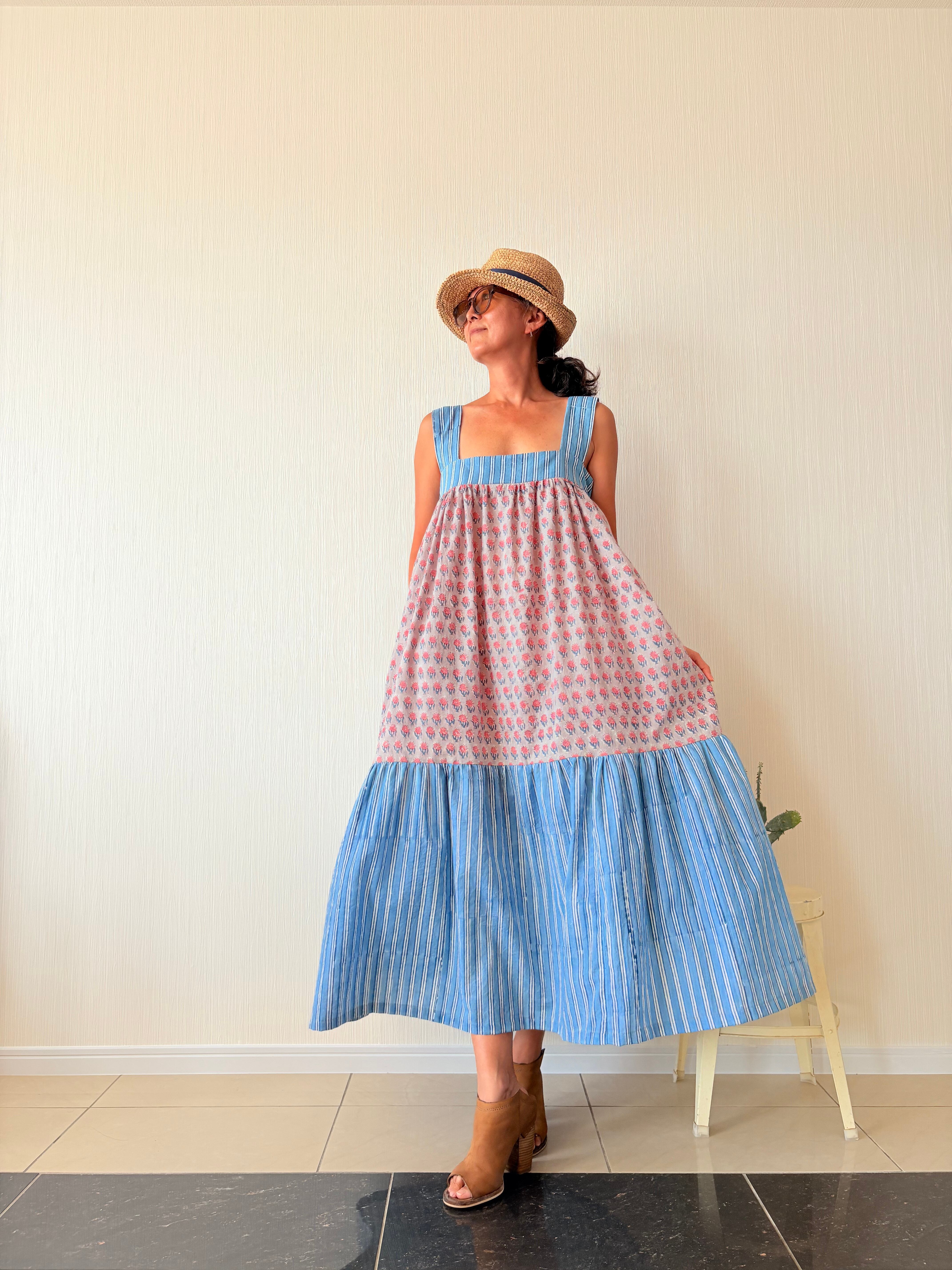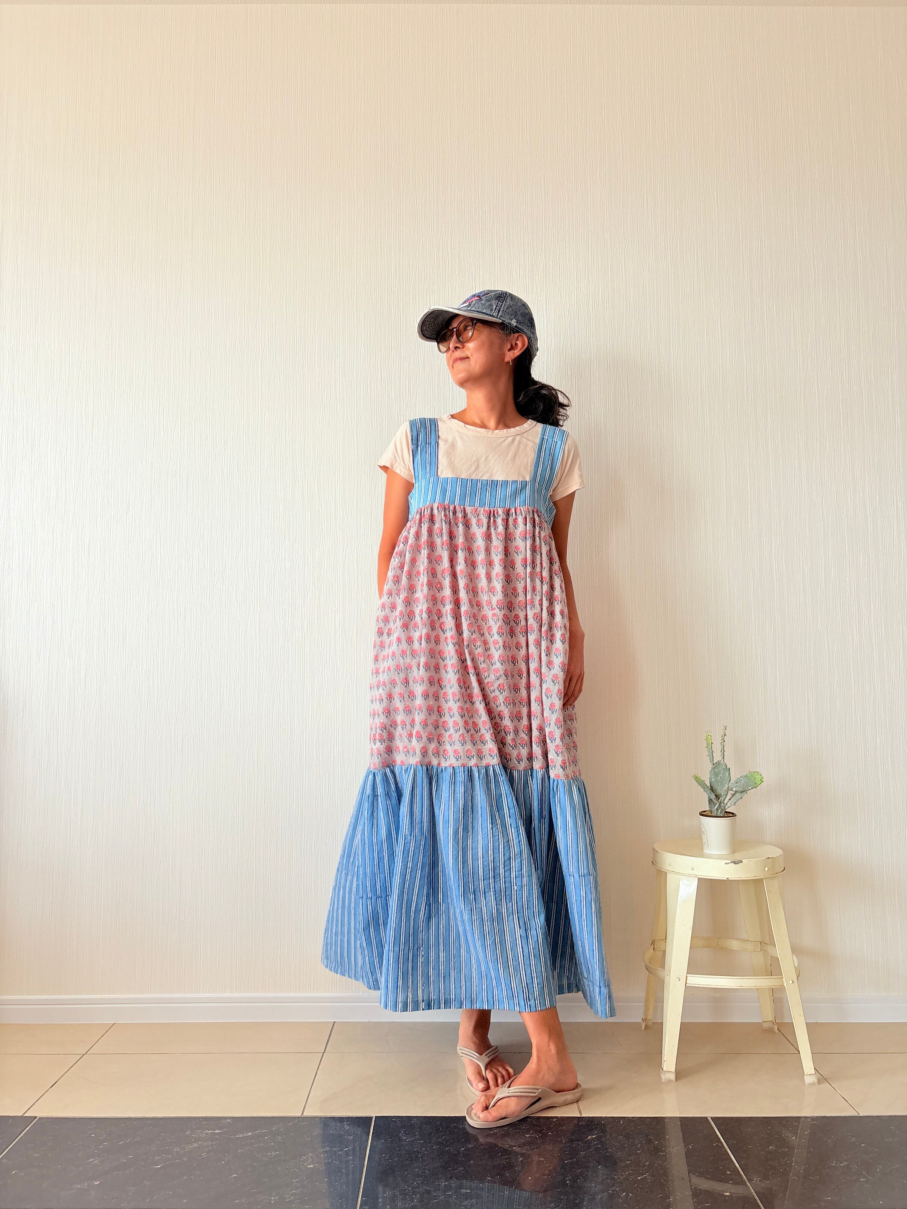 ふわっと軽いインド綿を贅沢に3m強使用し、バックリボンで胸囲も調節可能なフリーサイズのティアードワンピース出来ました!