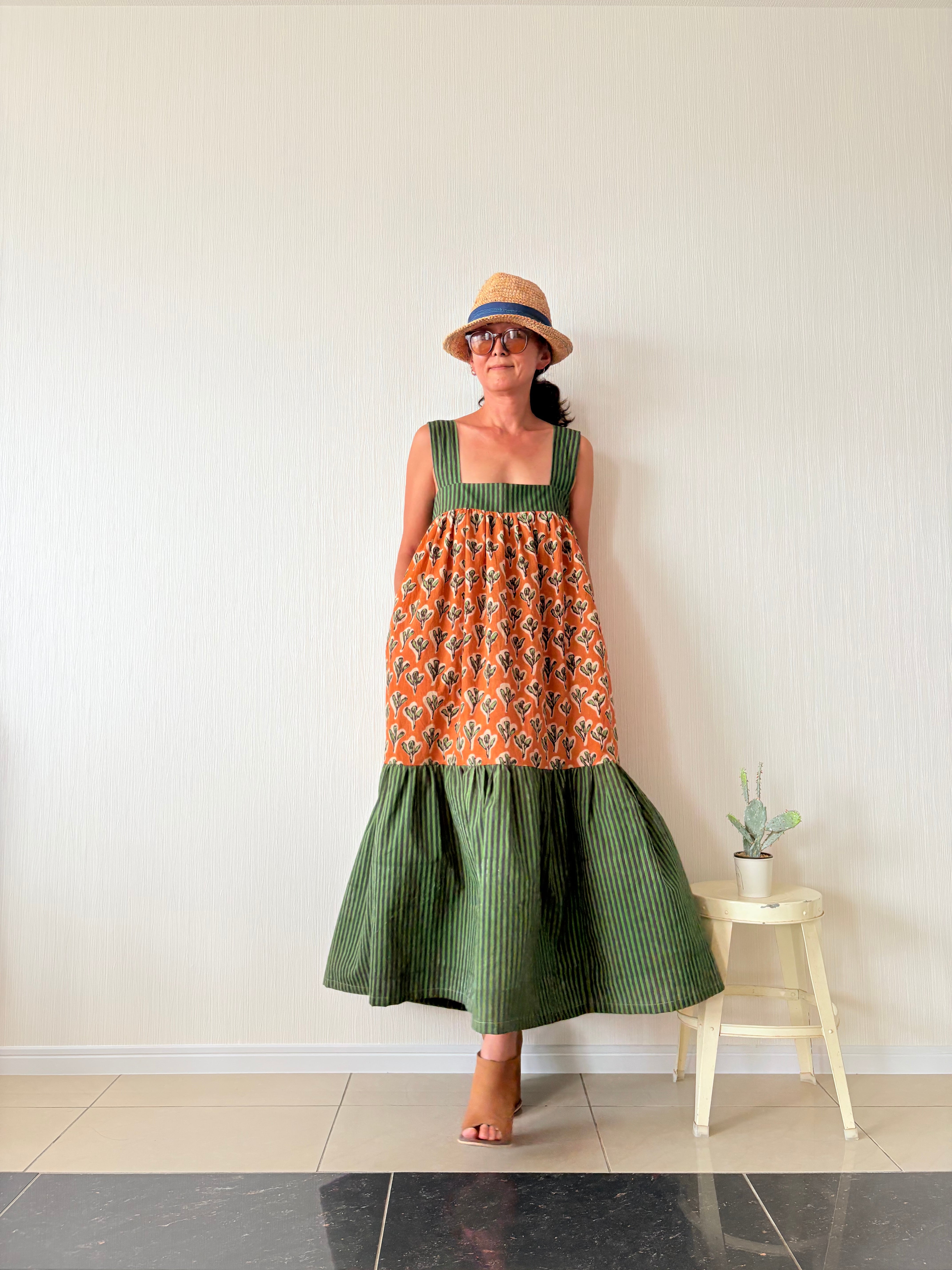 ふわっと軽いインド綿を贅沢に3m強使用し、バックリボンで胸囲も調節可能なフリーサイズのティアードワンピース出来ました!