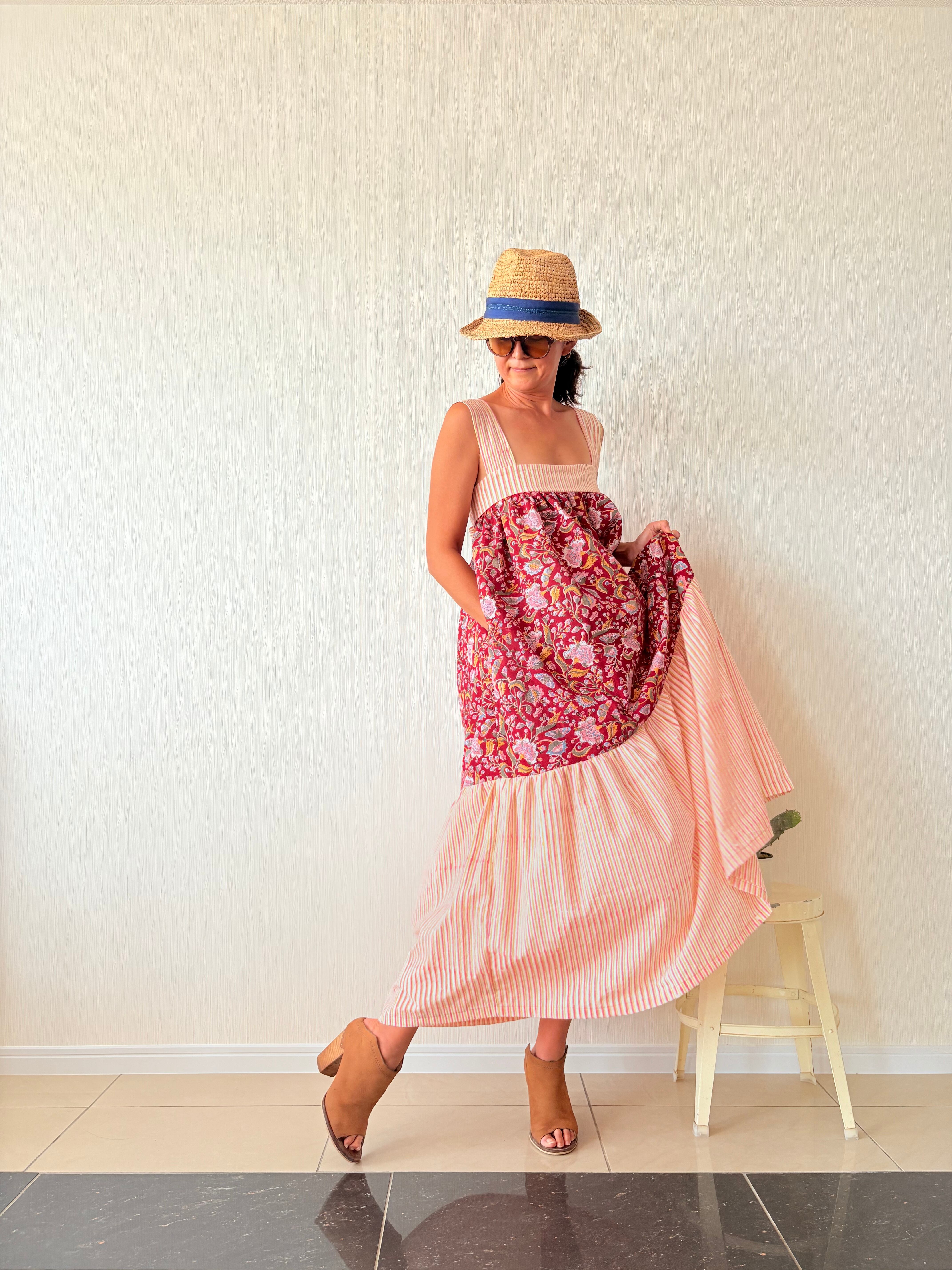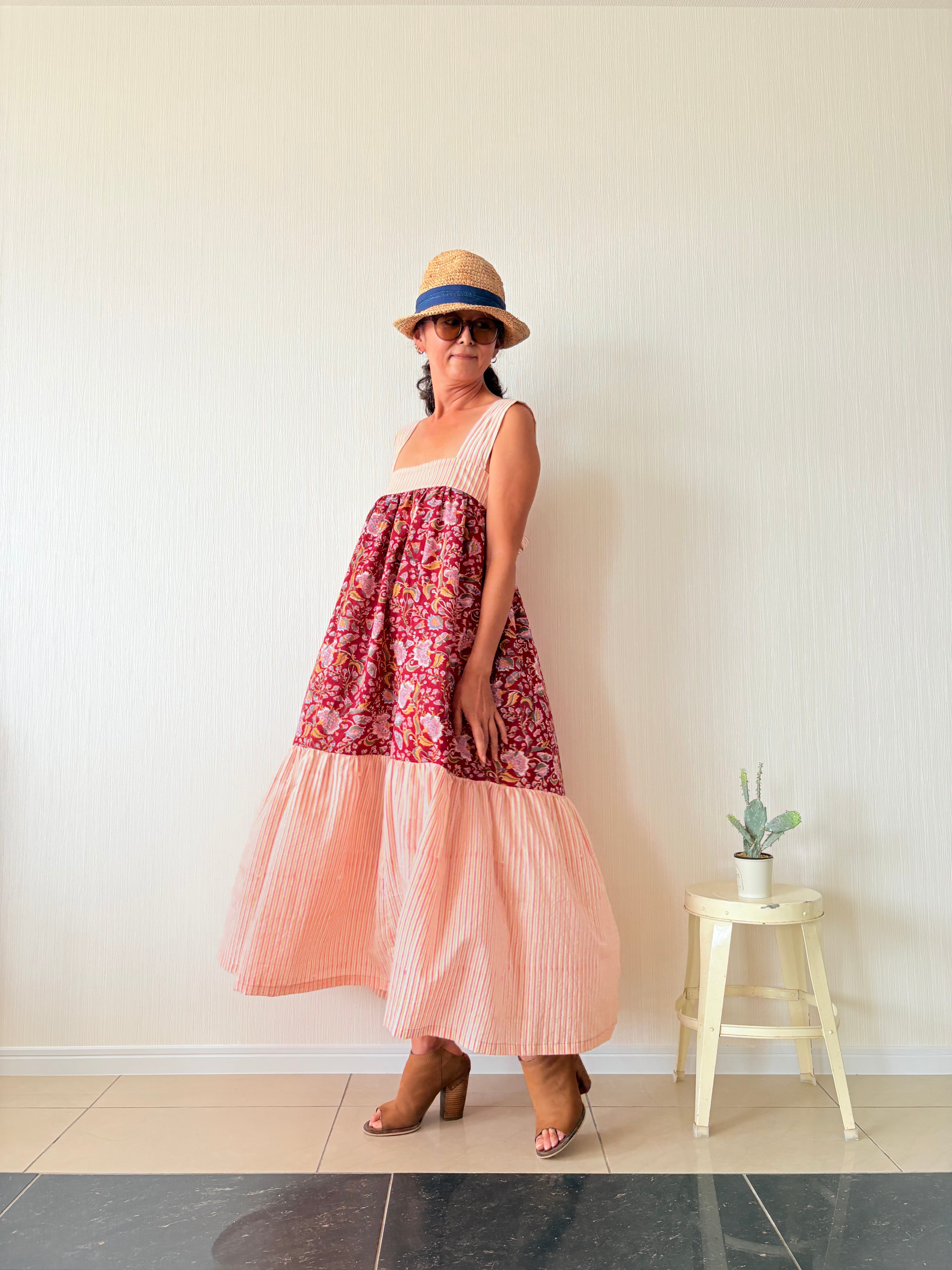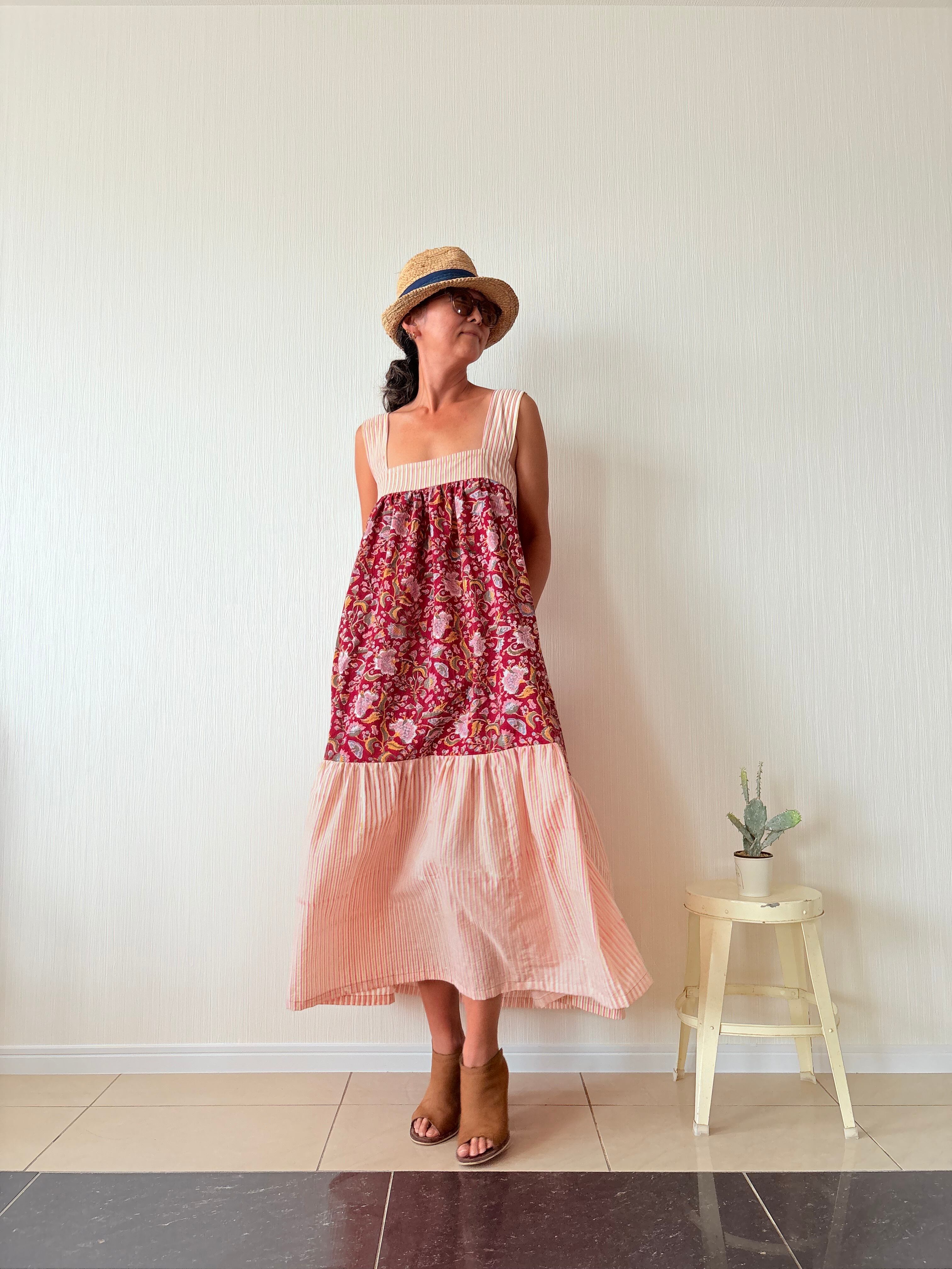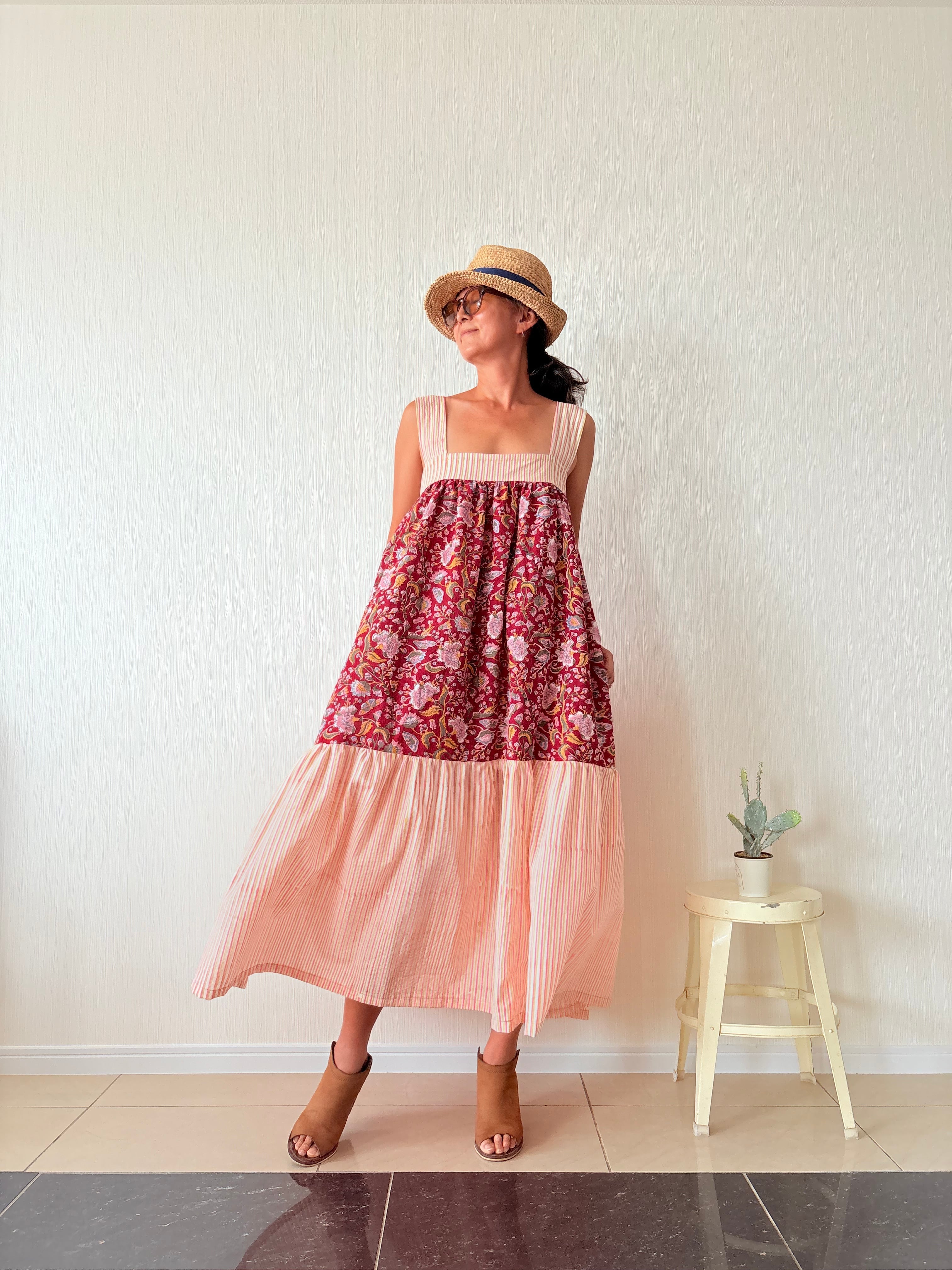 ふわっと軽いインド綿を贅沢に3m強使用し、バックリボンで胸囲も調節可能なフリーサイズのティアードワンピース出来ました!