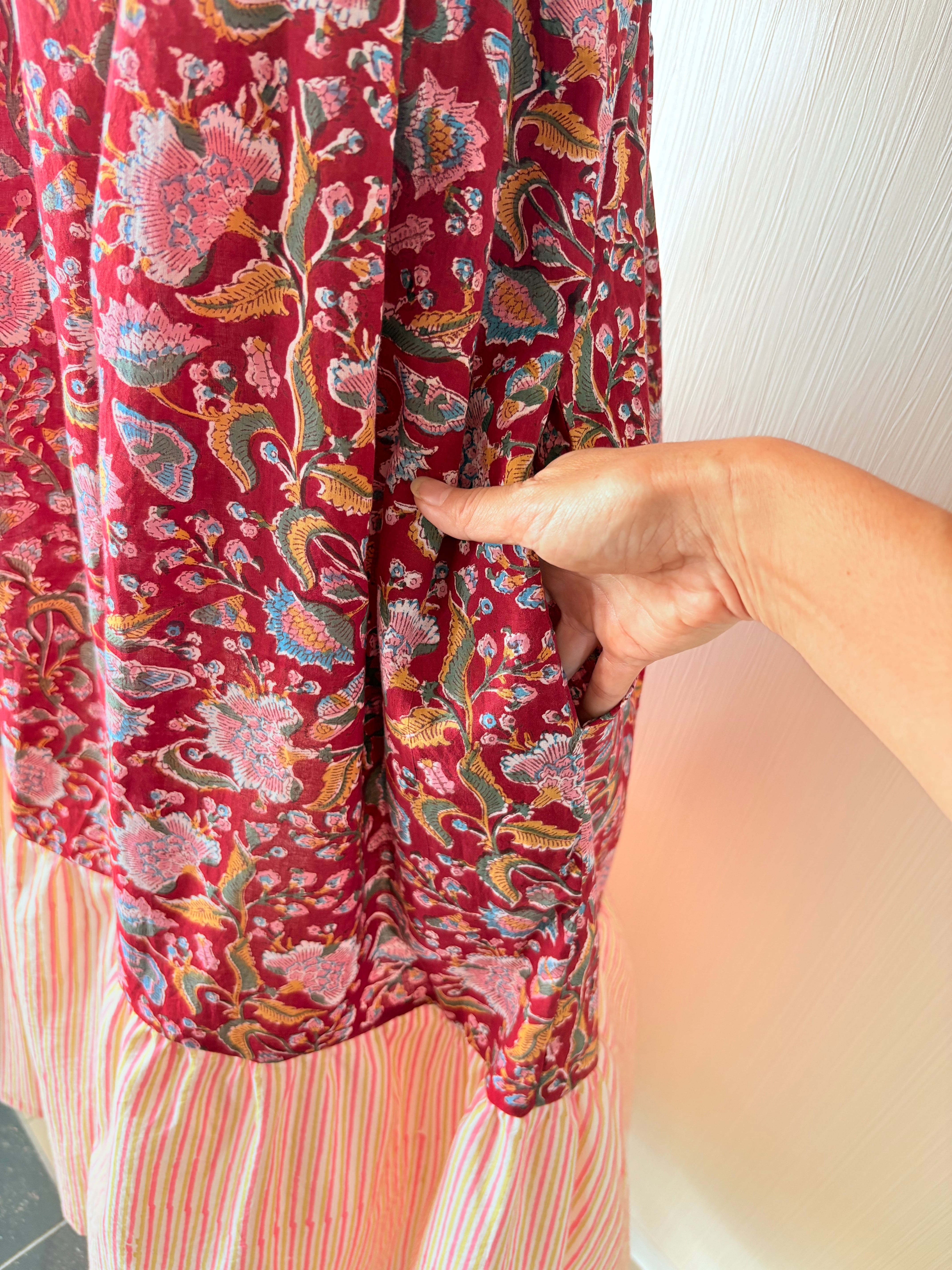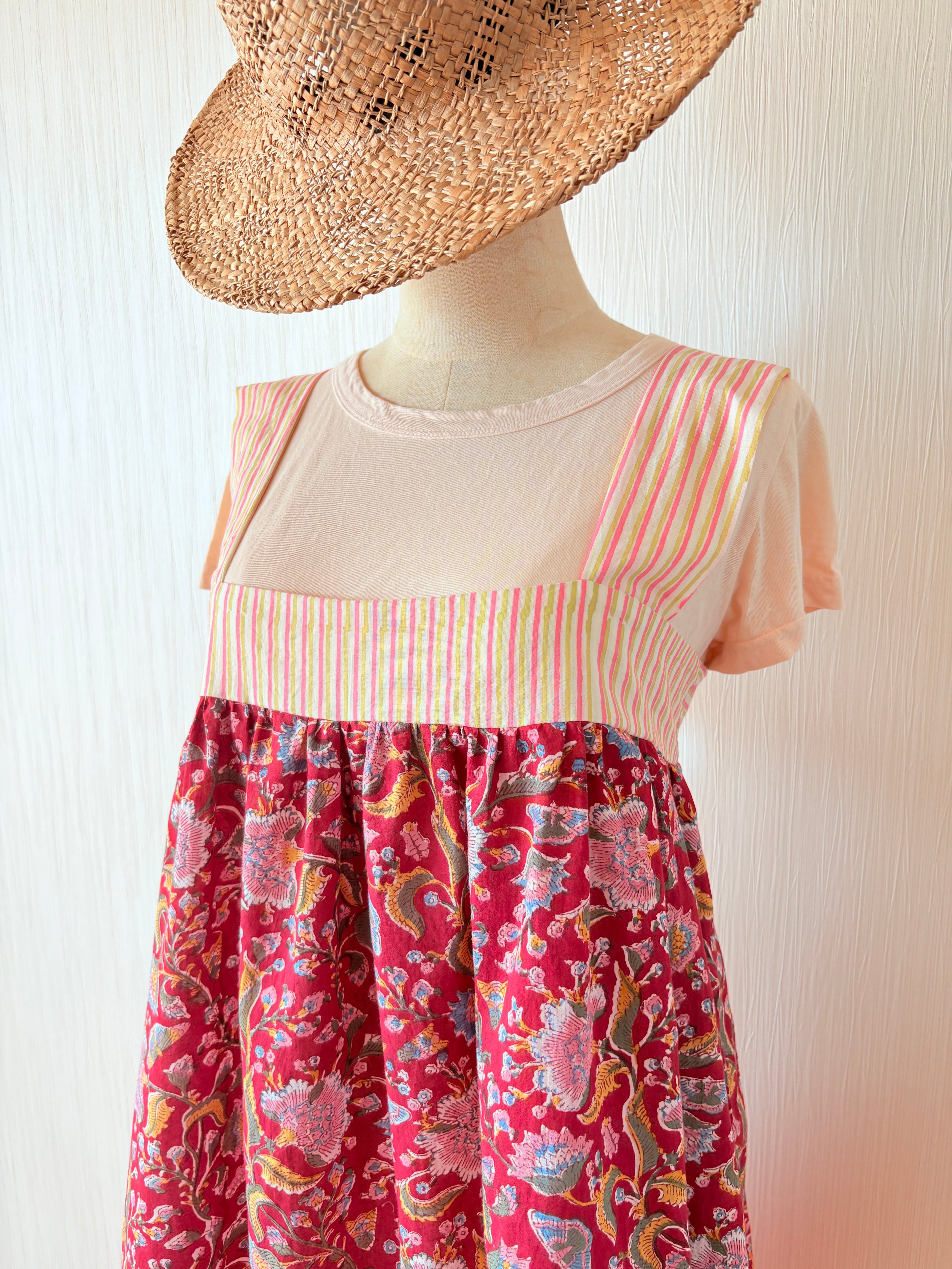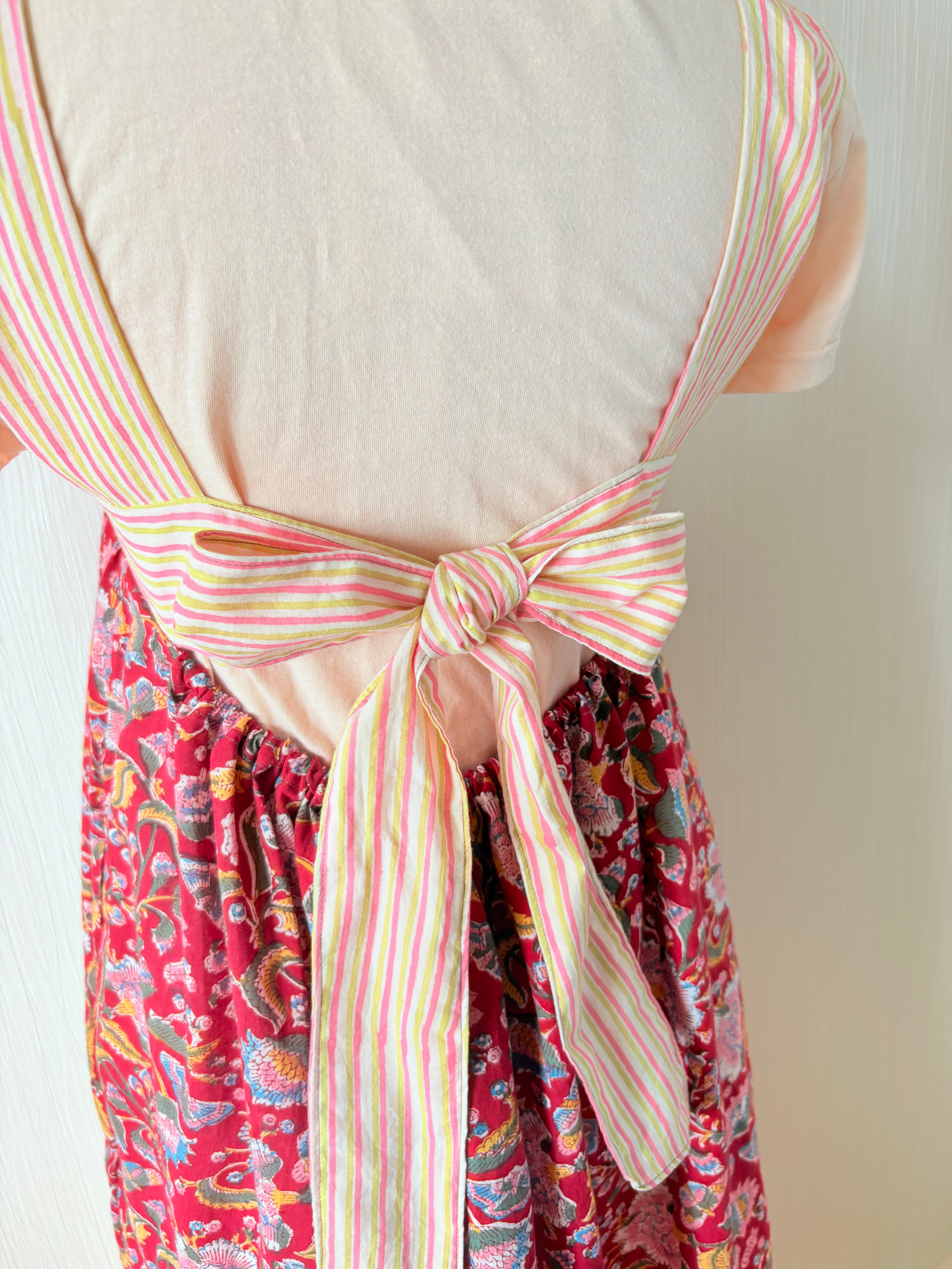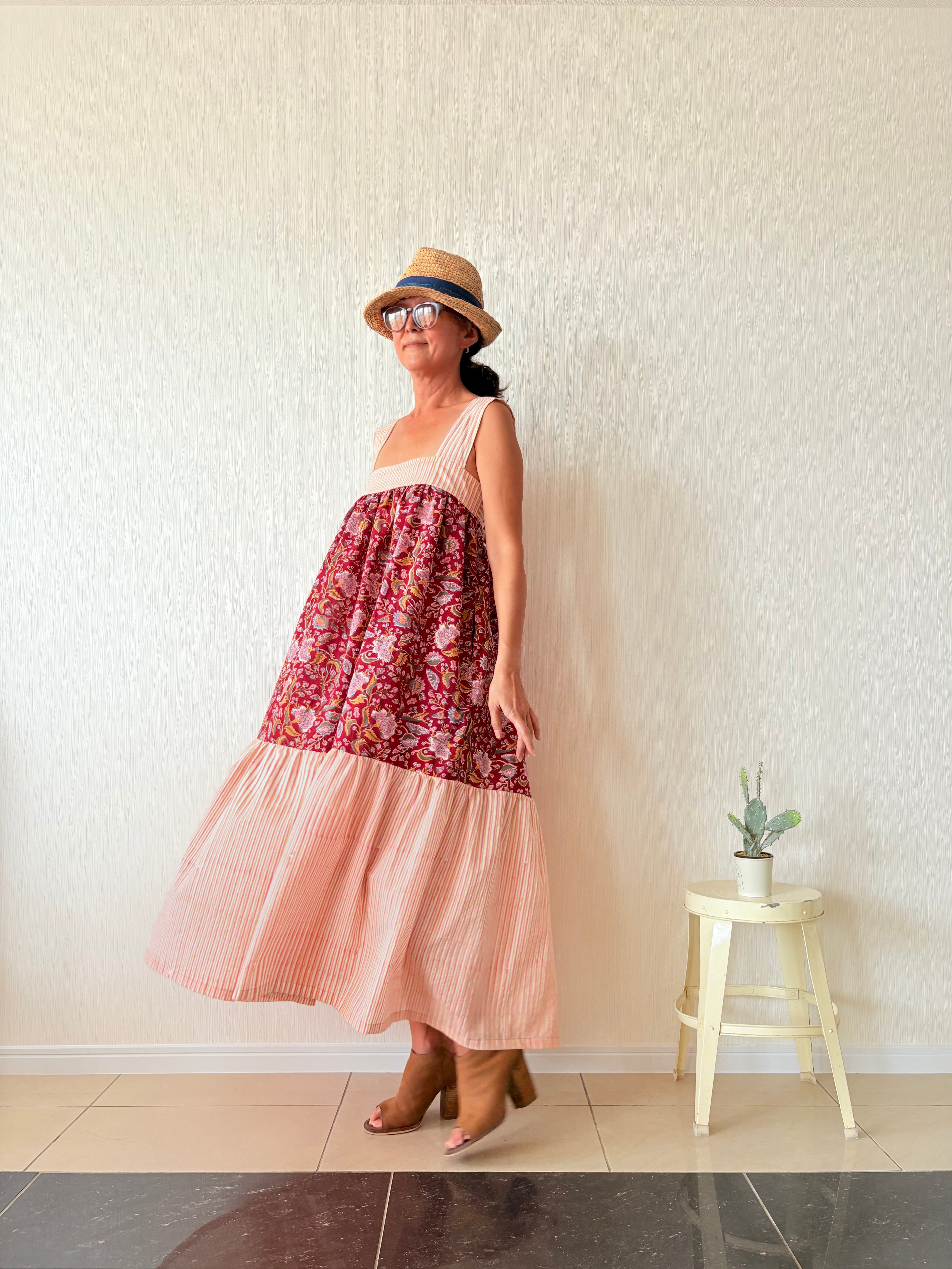 ふわっと軽いインド綿を贅沢に3m強使用し、バックリボンで胸囲も調節可能なフリーサイズのティアードワンピース出来ました!