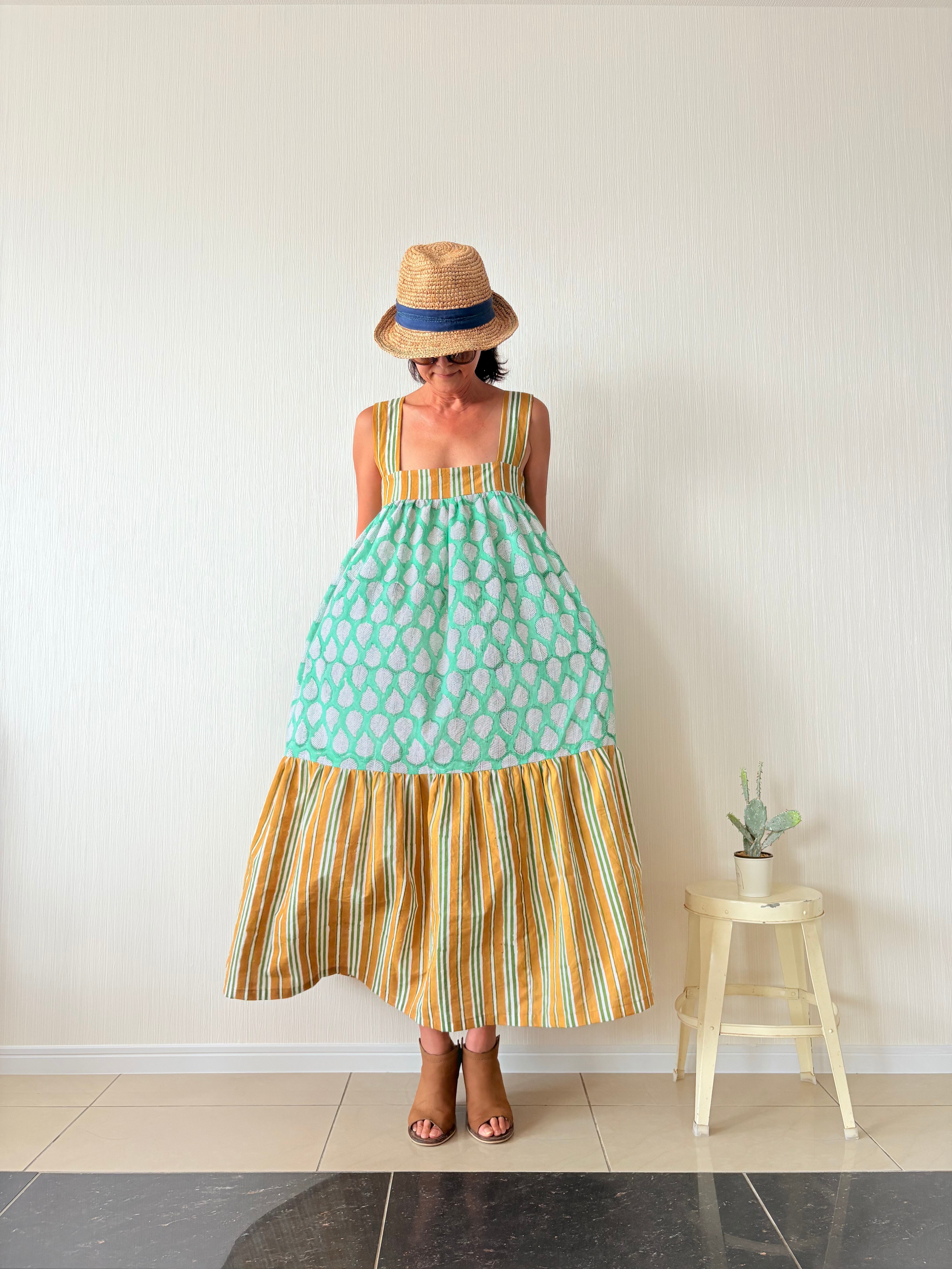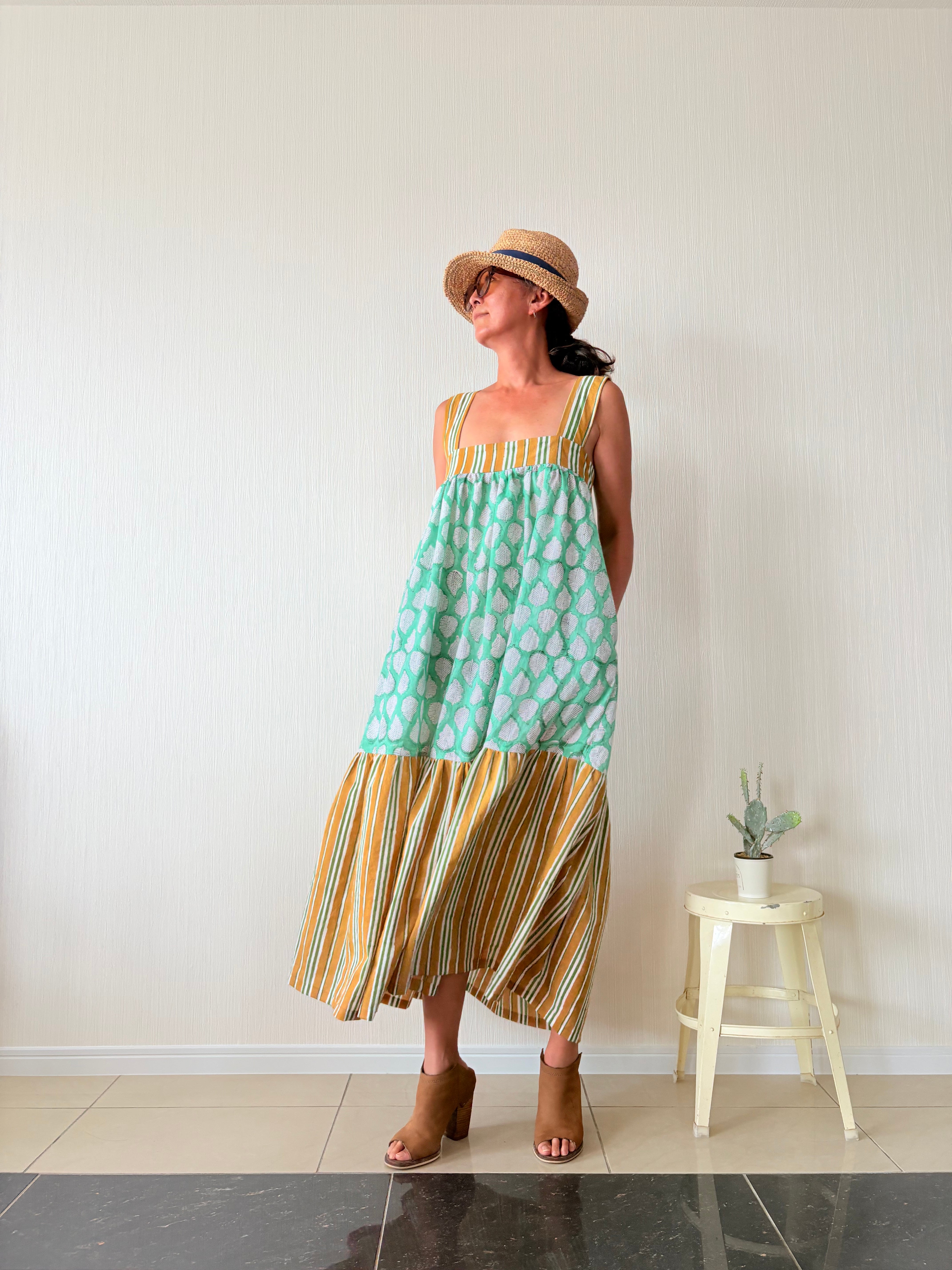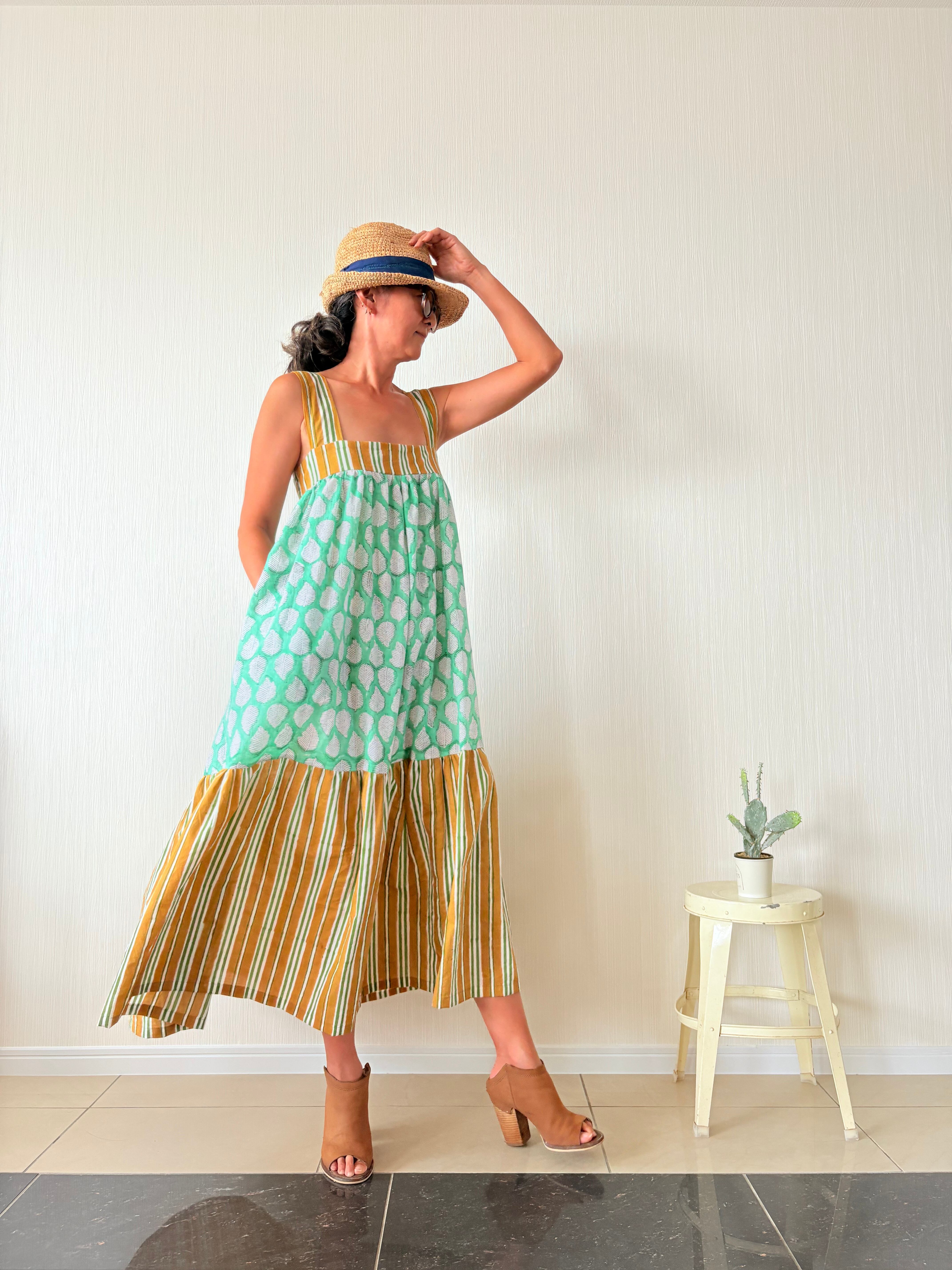 ふわっと軽いインド綿を贅沢に3m強使用し、バックリボンで胸囲も調節可能なフリーサイズのティアードワンピース出来ました!