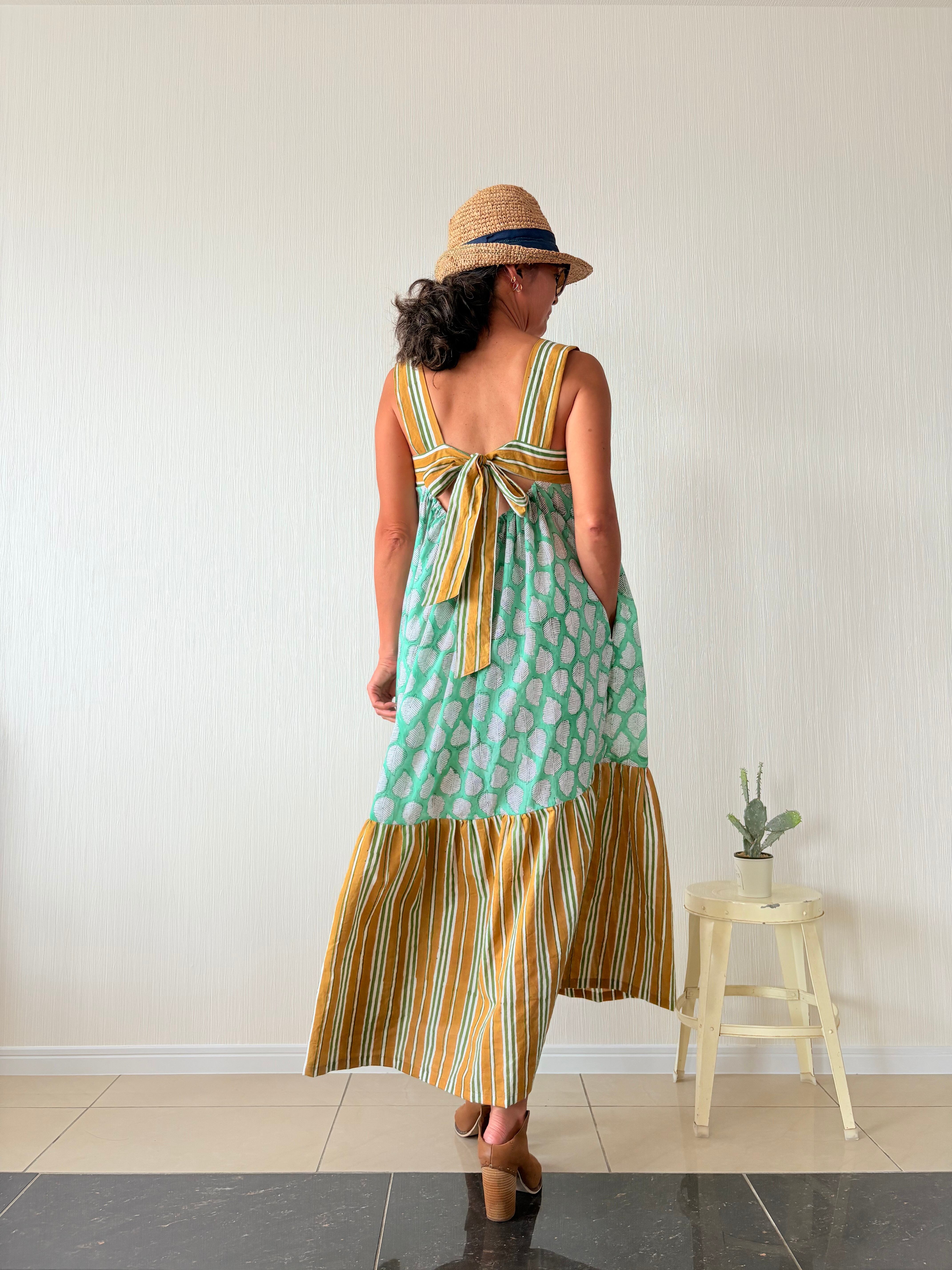 ◆インド綿 || バックリボンティアードワンピース || ブロックプリント