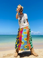 夏のビーサンやヒールのあるサンダルにスニーカーでも、冬はレギンスを下に履いてブーツも様になり着るシーズンを問いません。シンプルなTシャツやセーターもこれを下に履くだけでぐっとおしゃれに見える便利スカートです。フライトなどの長時間移動もらくちん、ウエストがまわってしまったとしても気にならない柄合わせで旅先でも重宝しますよ。