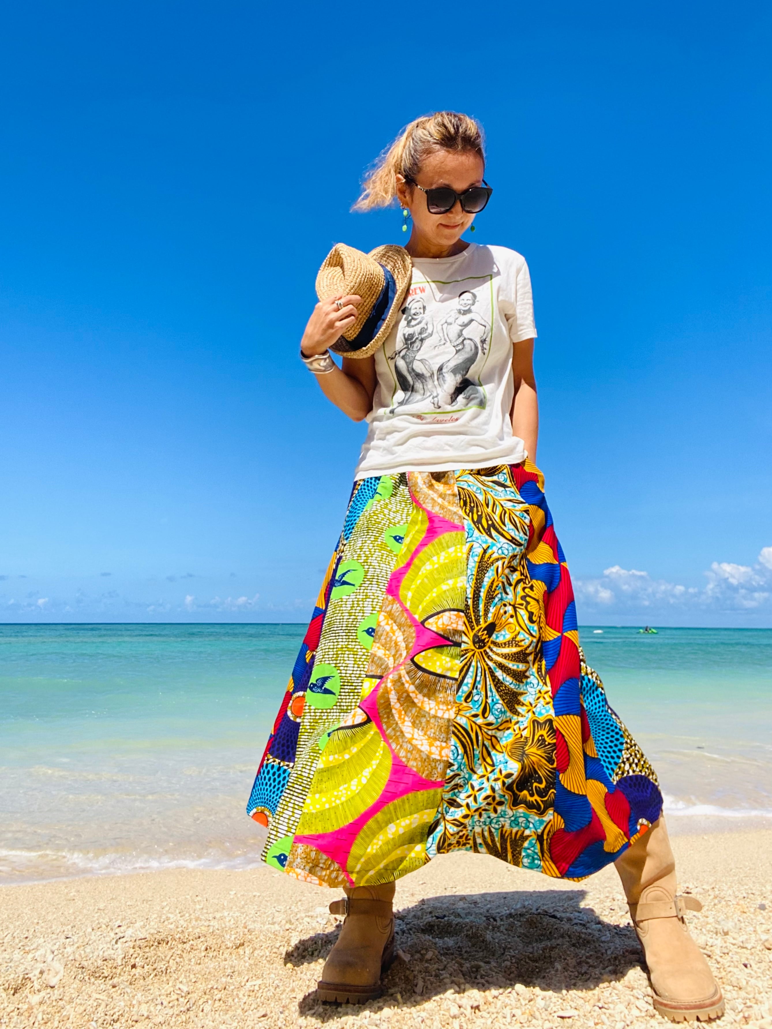 夏のビーサンやヒールのあるサンダルにスニーカーでも、冬はレギンスを下に履いてブーツも様になり着るシーズンを問いません。シンプルなTシャツやセーターもこれを下に履くだけでぐっとおしゃれに見える便利スカートです。フライトなどの長時間移動もらくちん、ウエストがまわってしまったとしても気にならない柄合わせで旅先でも重宝しますよ。
