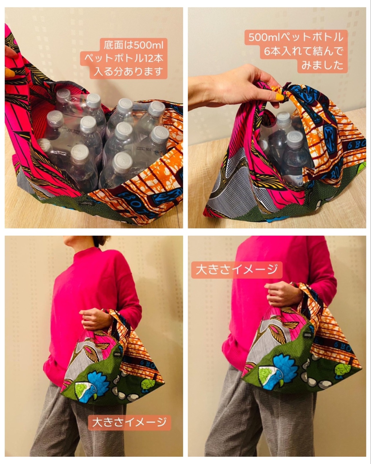 エコバッグというほど大きくはありませんがコンビニやパン屋にちょっとなどちょうど良い感じです。ケーキなどの箱物もすっぽり入って風呂敷のように持てますよ。