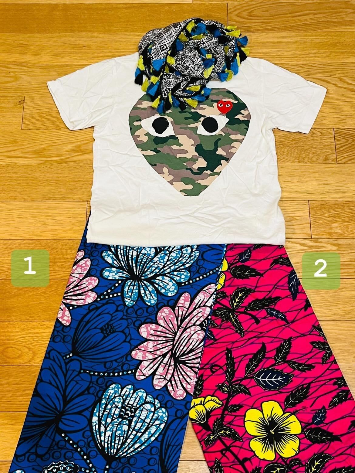 3. どちらかの脚の柄を指定、もう一枚はGreen Numberのセンスにお任せでリンクコーデできるキッズパンツを作製。キッズパンツの詳細はこちら:https://greennumber.base.shop/categories/4149786
